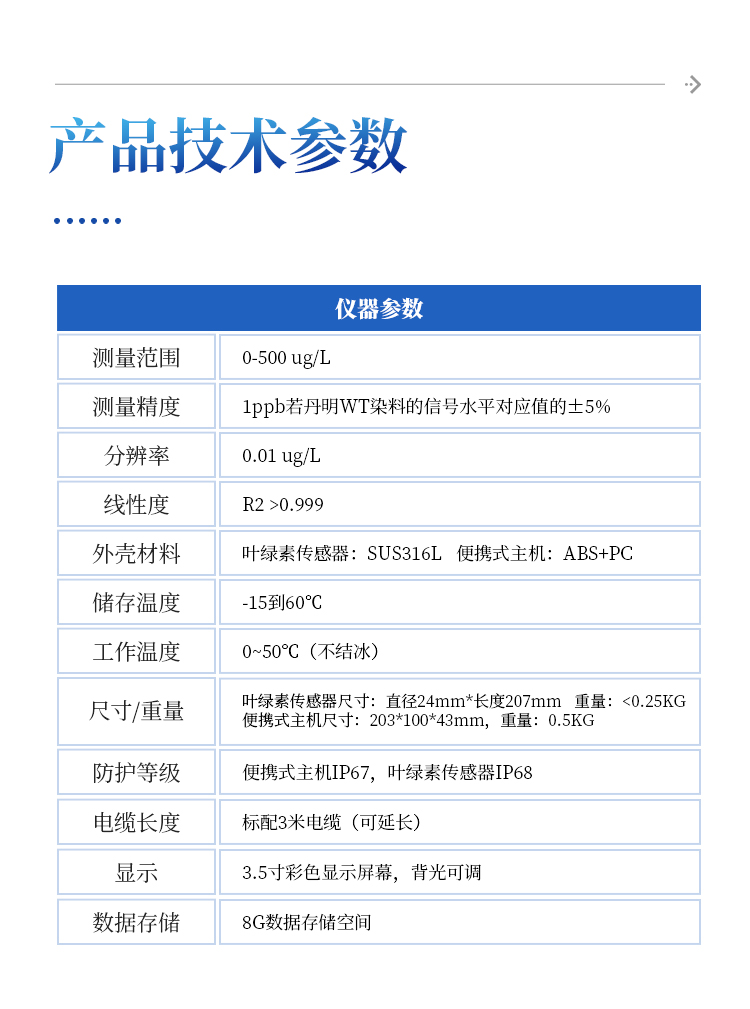 防护等级 | 便携式主机IP67,叶绿素传感器IP68 |