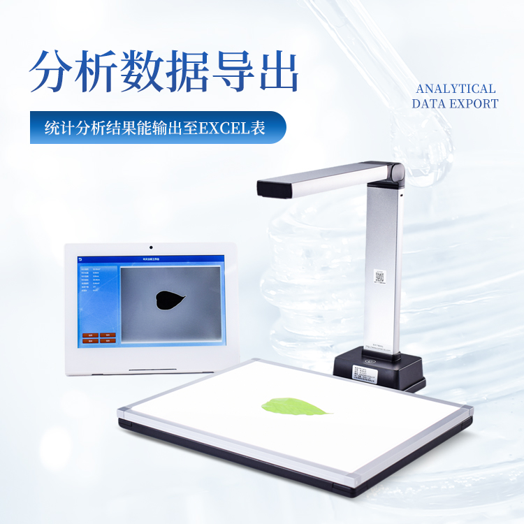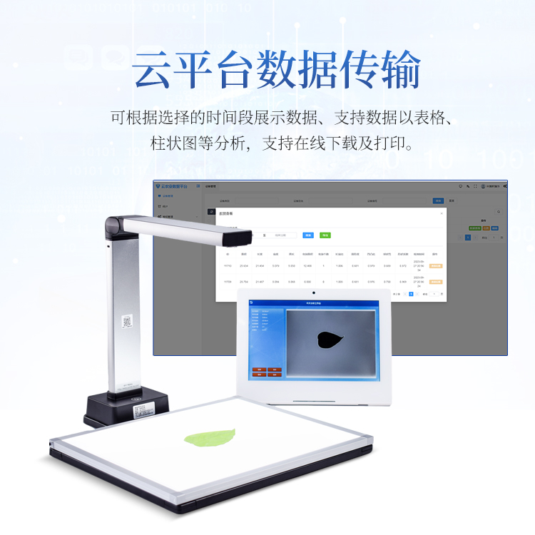 云平台数据传输:数据可上传至云平台,可按照任意时间段和叶片类别检索历史数据,可查看测量时间叶片面积、周长,最大叶长、最大叶宽,圆形度,凹凸比,球状性,形状系数,虫洞数量,虫洞面积等数据,可对不同参数做柱状图分析,支持数据以EXCEL表格形式导出,可根据选择的时间段展示数据、支持数据以表格、柱状图等分析、在线下载。
