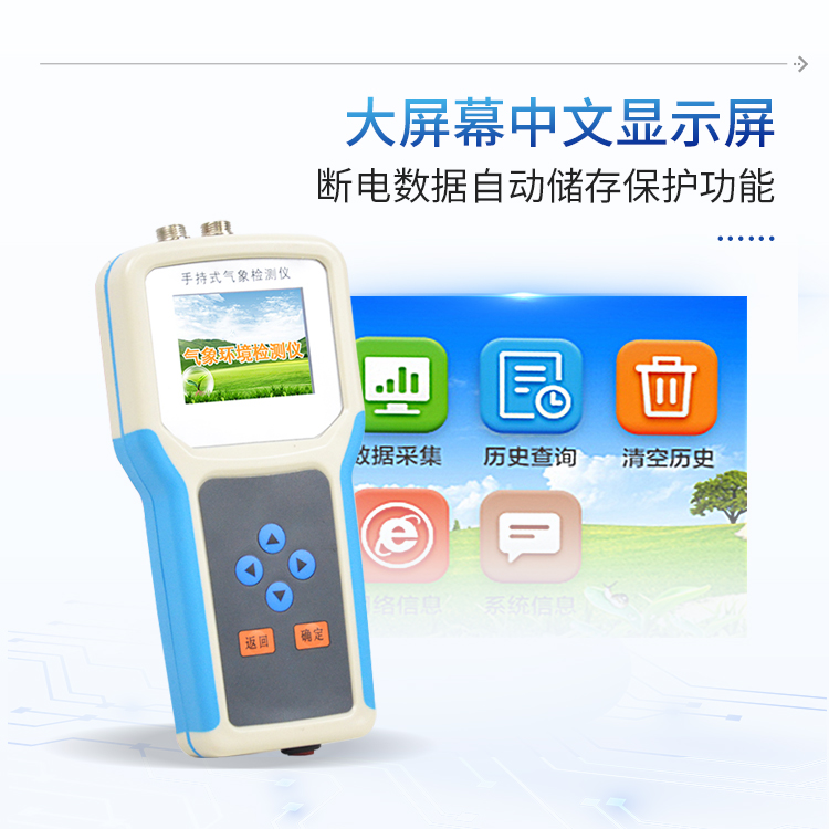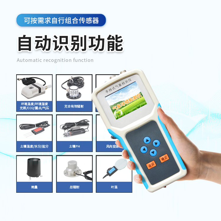 手持气象站是我们专门针对农田、草场局部小尺度环境设计的,对与植被和农作物生长密切相关的土壤、水气等环境参数监测的农田小气候站。它主要观测与农业相关的空气温度、空气湿度、光照强度、二氧化碳浓度、露点温度、光合有效辐射、土壤温度、土壤湿度、土壤盐分、土壤PH等10个环境参数气象要素,为农业科研、农业生产等提供良好的支持。