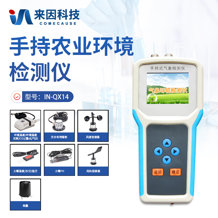 手持式智能农业气象环境检测仪是我们专门针对农田、草场局部小尺度环境设计的,对与植被和农作物生长密切相关的土壤、水气等环境参数监测的农田小气候站。它主要观测与农业相关的空气温度、空气湿度、光照强度、二氧化碳浓度、露点温度、光合有效辐射、土壤温度、土壤水分、土壤盐分、土壤PH、风速、风向、降雨量、大气压力等14个环境参数气象要素,为农业科研、农业生产等提供良好的支持。