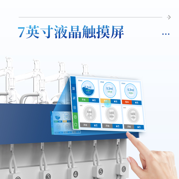 2、采用7寸液晶触摸屏控制,蒸馏方法可设置,自动保存,下次开机可直接使用;系统自带校正蒸馏体积(重量)功能。