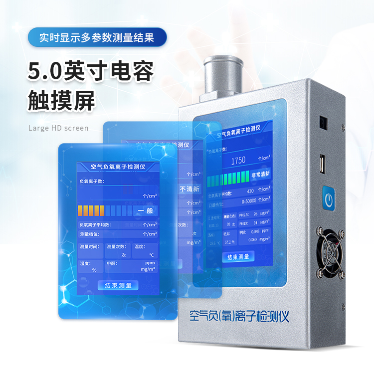 1、屏幕显示:5.0英寸电容触摸屏,800*480高分辨率,实时显示负(氧)离子测量结果;