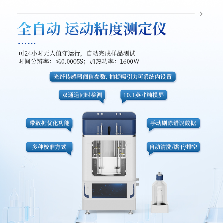 全自动运动粘度仪是用于精确测量液体流动特性的智能化仪器,具备自动温控、数字计算等功能。相比于传统粘度仪,本仪器采用红外检测原理,配合气泵、电磁阀等部件,可24小时无人值守运行,自动完成样品测试,极大提高了实验室的工作效率,消除了人为操作误差,温度和流程控制极其精确,结果可靠。