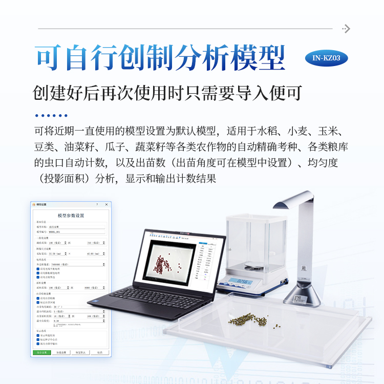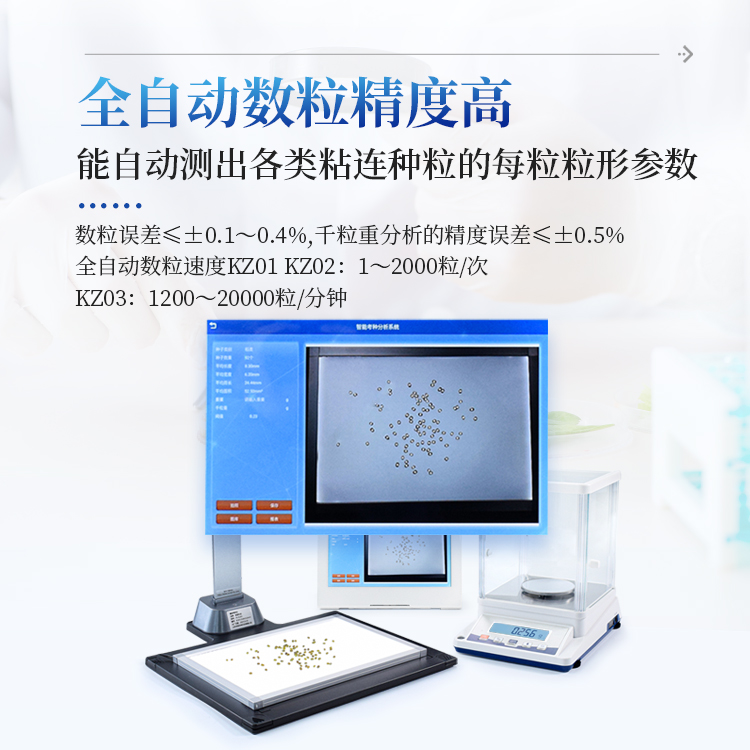 智能考种系统可以测量各种表面光滑的籽粒的数量、千/百粒重与平均粒型(包括长、宽、长宽比、周长、面积),利用图像ORC 识别技术、图像定位、空间转换等技术实现快速识别种子数量及作物性状指标。