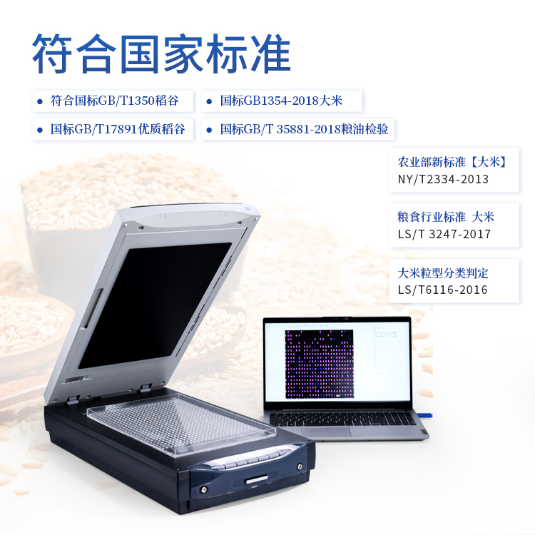 5、可大批量自动分析处理与输出结果。与国标GB/T1350稻谷、GB/T17891优质稻谷或GB1354-2018大米、农业部新标准【大米】NY/T2334-2013、大米粒型分类判定LS/T6116-2016、粮食行业标准 大米LS/T 3247—2017、GB/T 35881-2018粮油检验 稻谷黄粒米含量测定图像分析法等标准相对应,检测各项指标的质量比和粒数比。