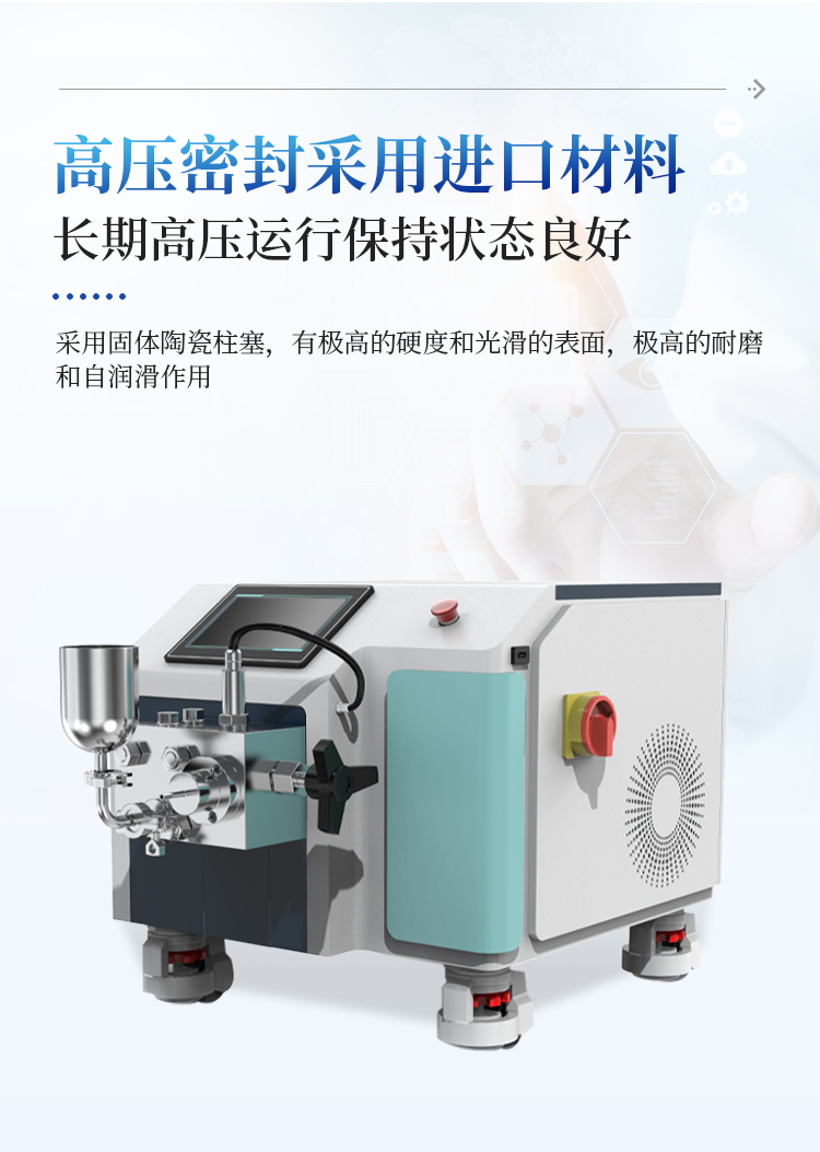 高压均质机是以高压往复泵为动力传递及物料输送机构,将物料输送至工作阀部分。物料在通过工作阀的过程中,在高压下产生强烈的剪切、撞击和空穴作用,从而使液态物质或以液体为载体的固体颗粒得到超微细化。