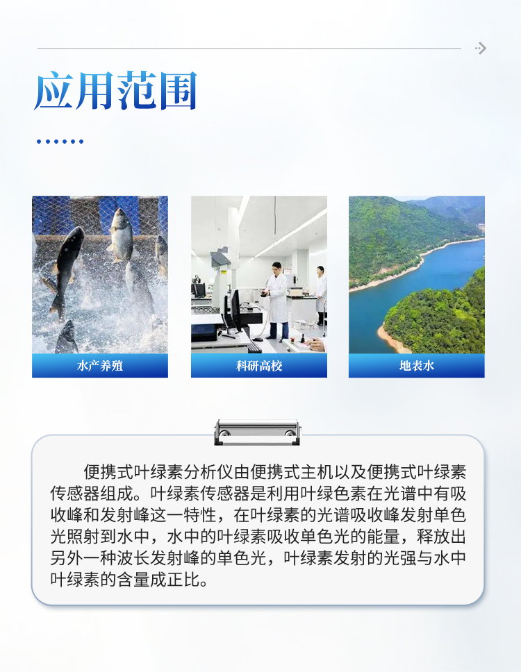 广泛应用于水产养殖、地表水、科研高校等行业和领域水中叶绿素的现场便携式监测;
