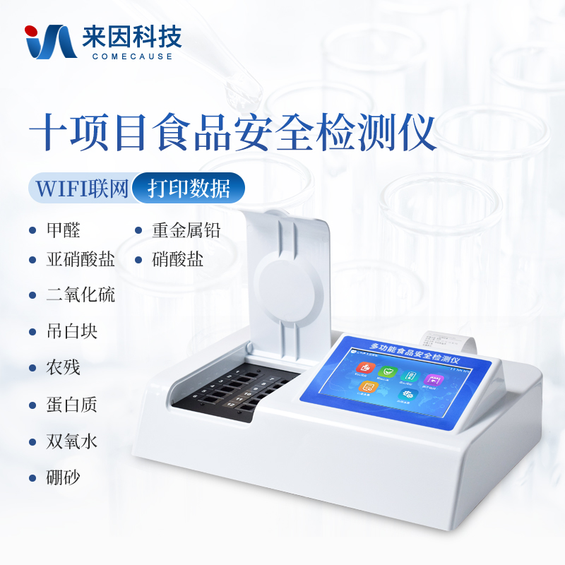 可快速检测各类食品中的甲醛、吊白块、二氧化硫、亚硝酸盐、双氧水、硼砂、农药残留、乳及乳制品中蛋白质、硝酸盐、重金属铅的含量,仪器预留其他项目检测程序和端口,根据日后需求可方便的自主增加检测项目。