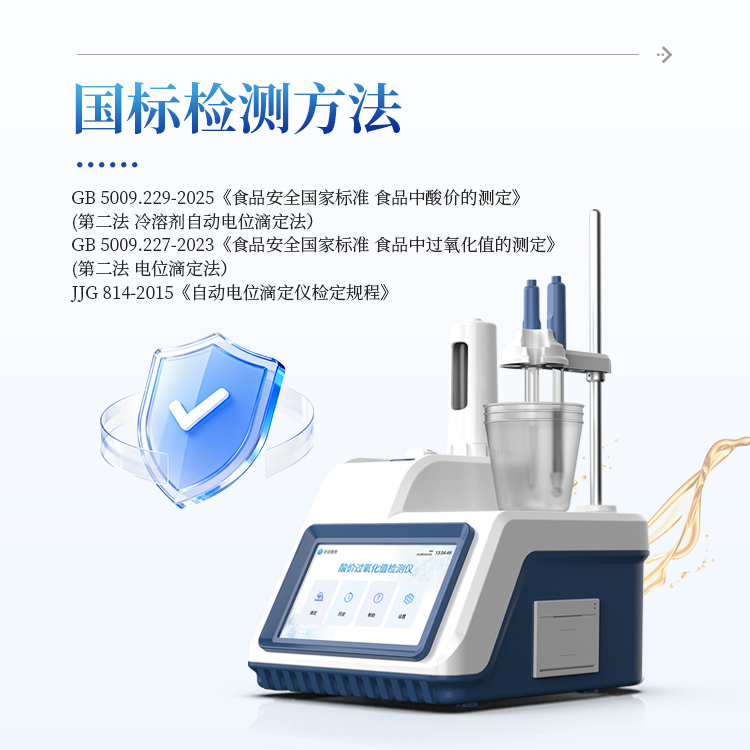 过氧化值测定:采用电位滴定法。油脂经异辛烷-冰乙酸(2:3)溶解,过氧化物与碘化钾反应生成碘,以硫代硫酸钠标准溶液滴定,仪器通过电位突跃自动判定终点,计算过氧化值。