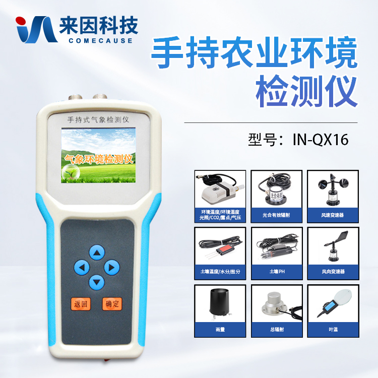 手持式智能农业气象环境检测仪是我们专门针对农田、草场局部小尺度环境设计的,对与植被和农作物生长密切相关的土壤、水气等环境参数监测的农田小气候站。它主要观测与农业相关的空气温度、空气湿度、光照强度、二氧化碳浓度、露点温度、光合有效辐射、土壤温度、土壤水分、土壤盐分、土壤PH、风速、风向、降雨量、大气压力、总辐射、叶面温度等16个环境参数气象要素,为农业科研、农业生产等提供良好的支持。