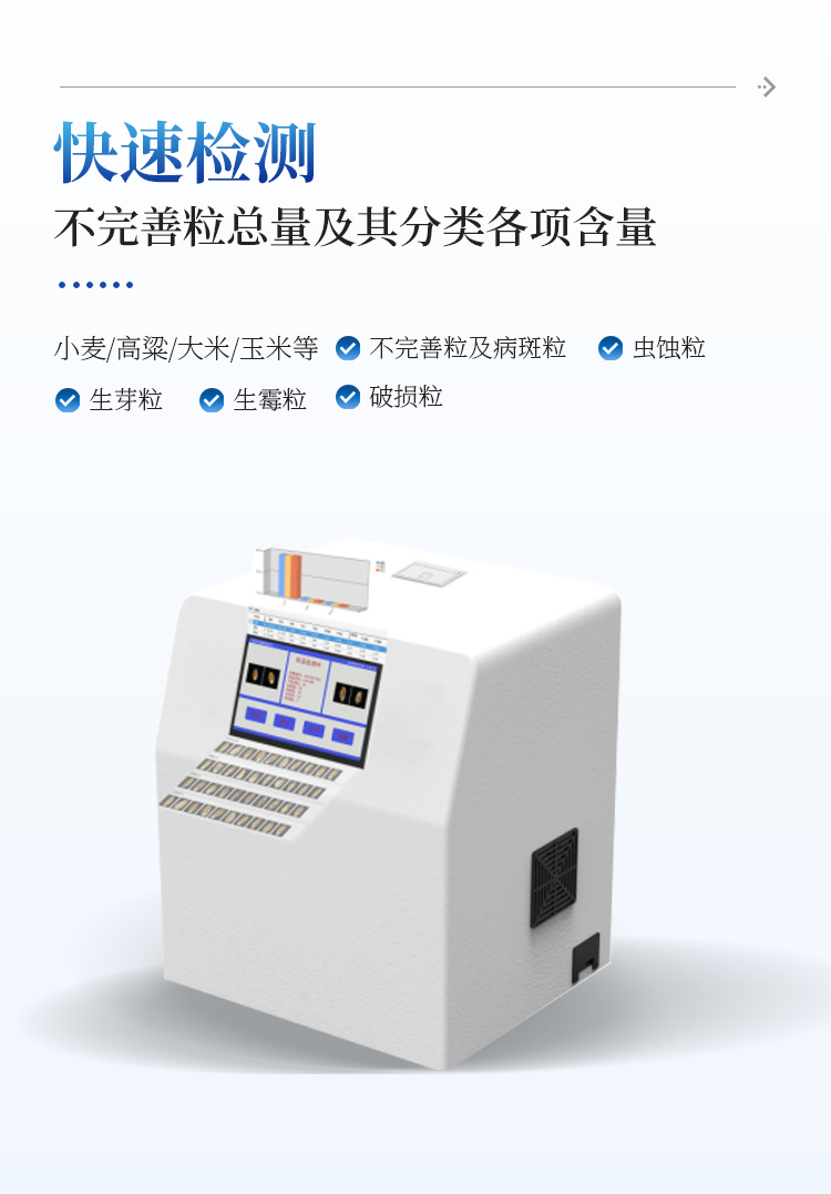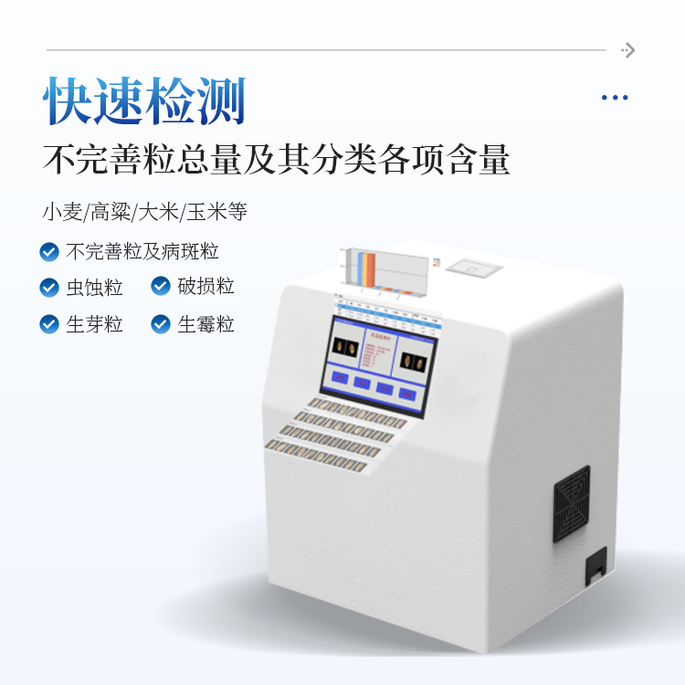 不完善粒测定仪是以小麦/高粱/大米等作物不完善粒作为测定对象,在自动获取粮食图像后,通过模式识别或深度学习等技术构建神经网络模型,实时分析粮食特征并计算出不完善粒百分比的专用仪器。