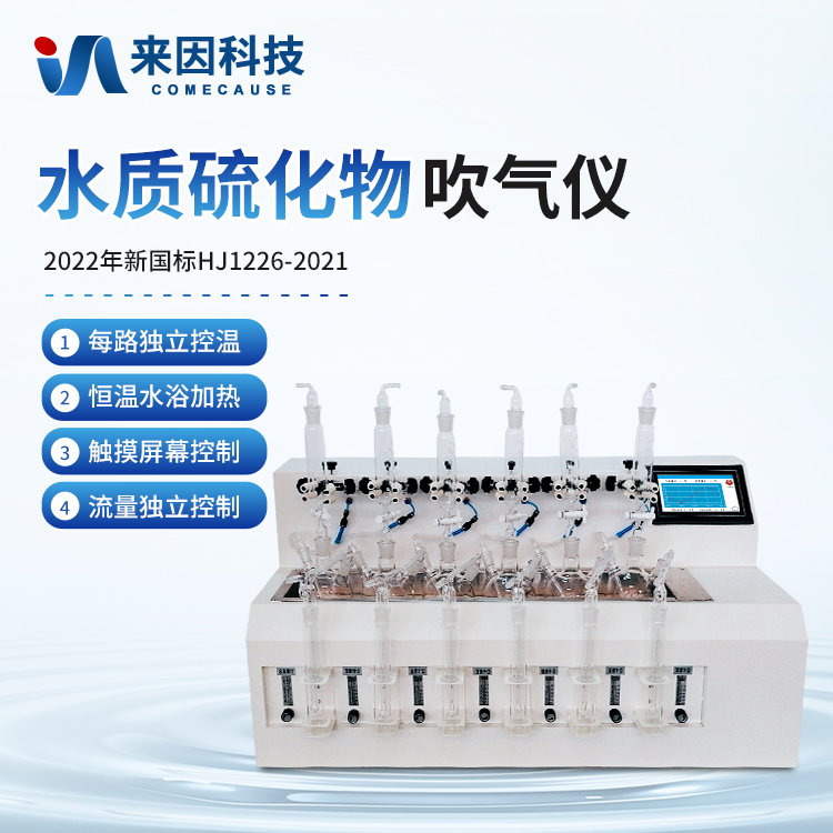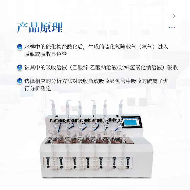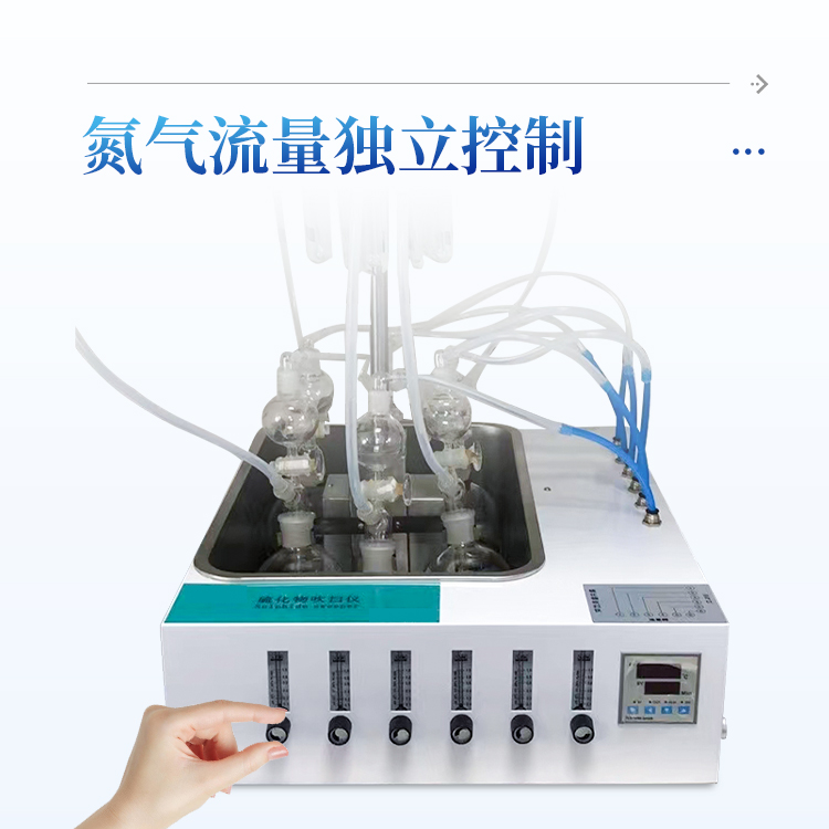 水样中的硫化物经酸化,生成的硫化氢随载气(氮气)进入吸收瓶/吸收显色管中被吸收溶液(乙酸锌-乙酸钠溶液或2%氢氧化钠溶液)吸收,选择相应的分析方法对吸收瓶/吸收显色管中吸收的硫离子进行分析测定。水质硫化物酸化吹气仪根据2022年新国标水质硫化物的测定-亚甲基蓝分光光度法(典量法)标准开发生产的。水质硫化物测定的样品前处理需要。