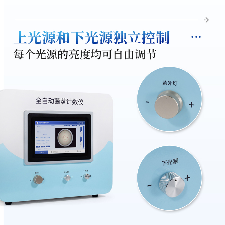 该系列全自动菌落计数仪配备了灵活的上、下双光源系统,用户可以根据不同培养皿的类型、菌落特性以及背景情况,用软件自由调节光源以获得最佳的成像效果。