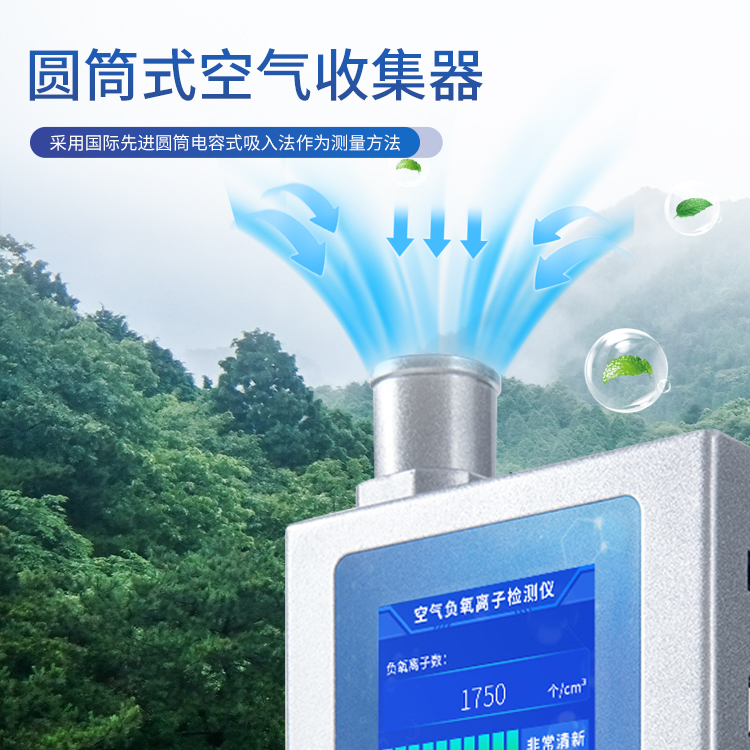 采用“电容式吸入法”原理进行负离子检测,测量空气中的负离子浓度值。在离子传感器(或称采集桶、采集筒)的极化板(或称偏压板)上加载定量的极化电压,再让被测空气按设定速度匀速通过传感器。空气中特定的小粒径负离子在电场的作用下发生偏转,被采集板所捕获。采集到的负离子负电荷量经过采集器的处理,即可计算出负离子的电荷浓度值。